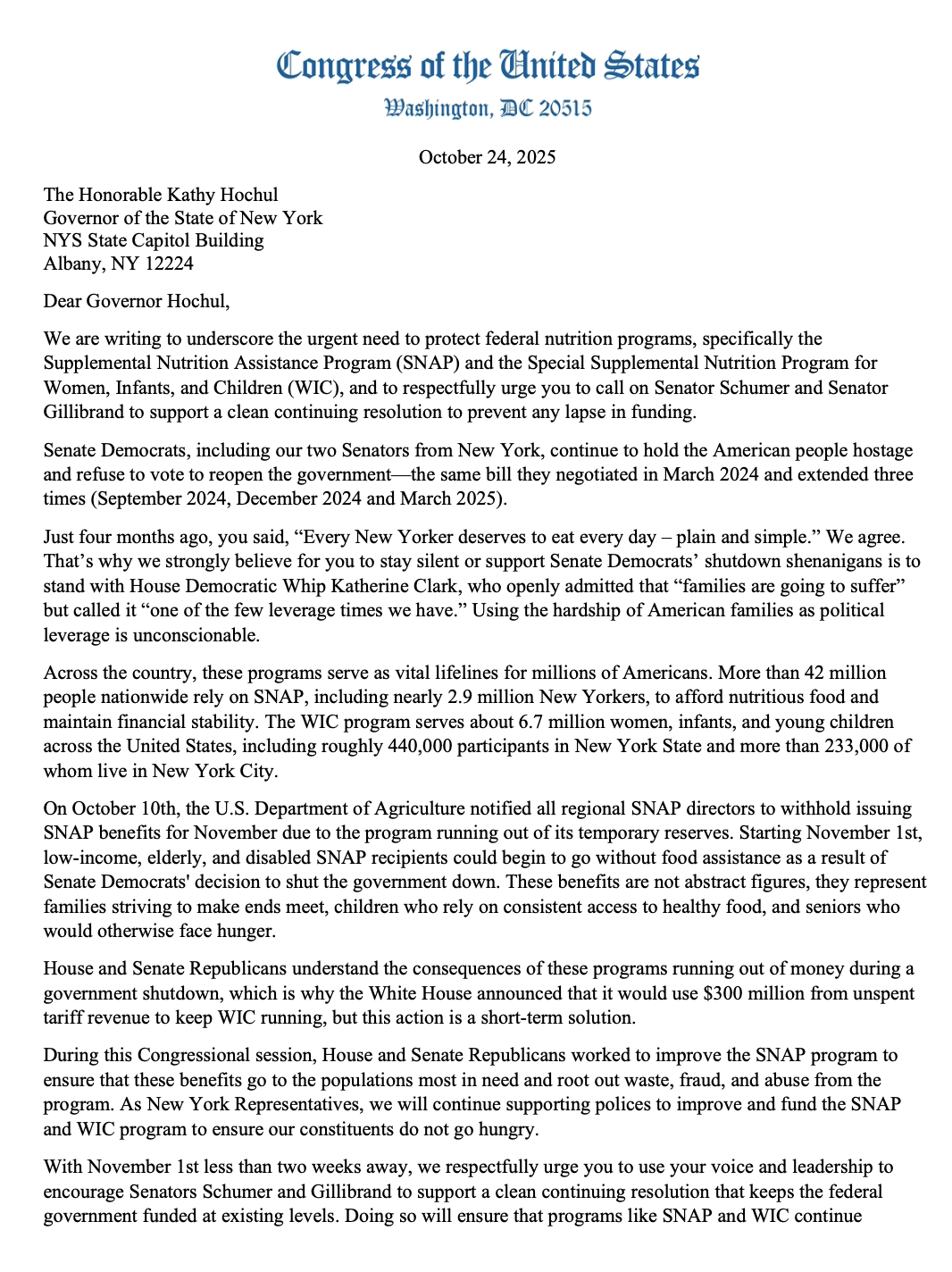 As the government shutdown nears one month, I’ve been calling on Senate Democrats to support the same funding levels they previously voted for. I supported this funding to keep our government open and ensure critical programs continued without interruption. This unnecessary shutdown, as I wrote in my recent op-ed, has already delayed $1.4 billion in funding for New York’s safety-net hospitals, put SNAP benefits for 42 million Americans at risk, forced more than 13,000 air traffic controllers and hundreds of thousands of other federal workers to work without pay, and caused small businesses in New York to lose roughly $40 million in loans each week. Fortunately, President Trump was able to shift excess funding from other programs so our military troops got paid and women with children received the food supplements through the WIC program, but these are just Band-Aids — and the money has run out. Senate Democrats need to stop playing these political games and do their part to reopen the government to avoid unnecessary pain on Americans.