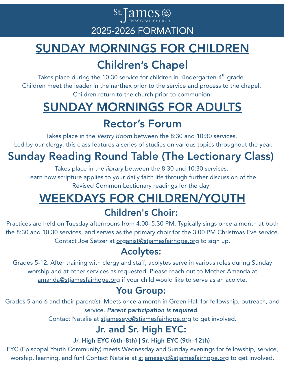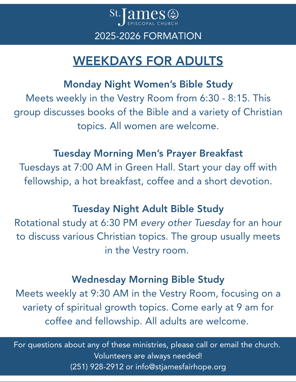 The St. James van is providing shuttle service from Fairhope West Elementary each Sunday beginning at 10:10am for the 10:30 services. (No shuttle for the 8:30 AM service) The last return route following the 10:30 service will leave the church by 12:05.