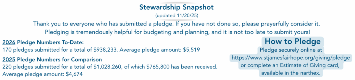 Christmas Flower Dedications - Remember or honor a loved one this Christmas! Forms are now available online and in Green Hall. Dedications submitted by December 15 will be included in all Christmas bulletins. https://www.stjamesfairhope.org/giving/christmas-flower-dedications