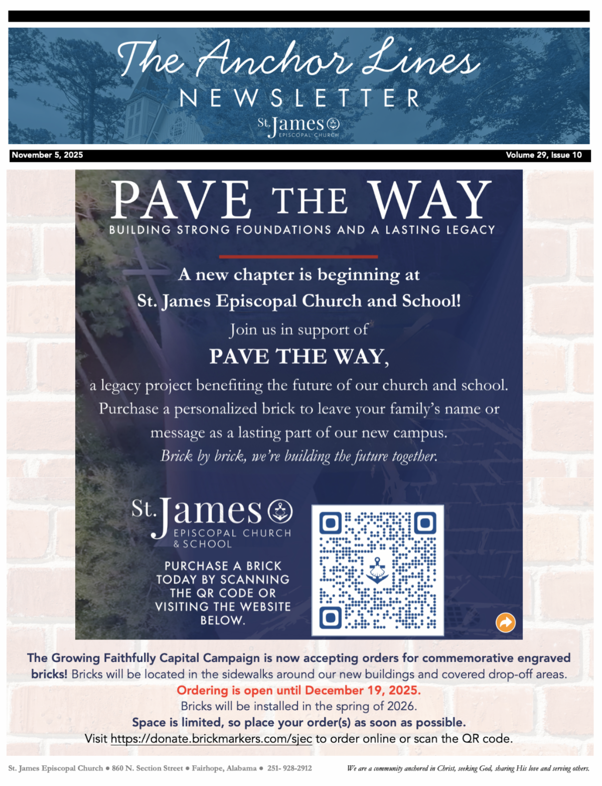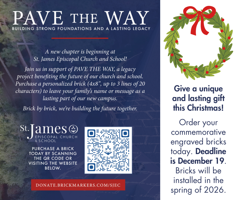 “Pave the Way” Engraved Bricks - Order your commemorative engraved bricks! These personalized bricks will be located in the sidewalks around our new buildings and covered drop-off areas. Ordering is open until December 19—only a few weeks left! Bricks will be installed in the spring of 2026. A commemorative brick would make a wonderful Christmas gift! Visit https://donate.brickmarkers.com/sjec to order online. Forms are also available in Green Hall.