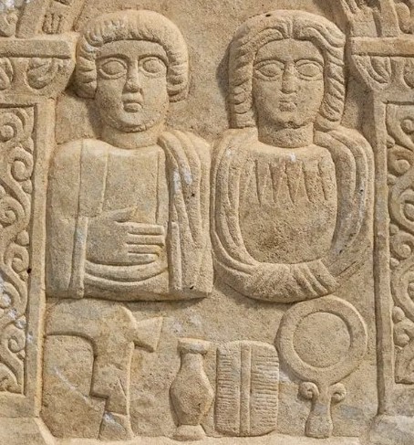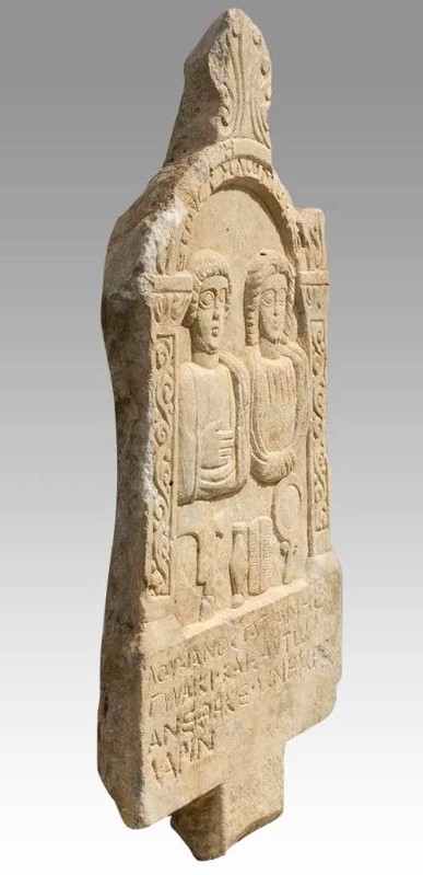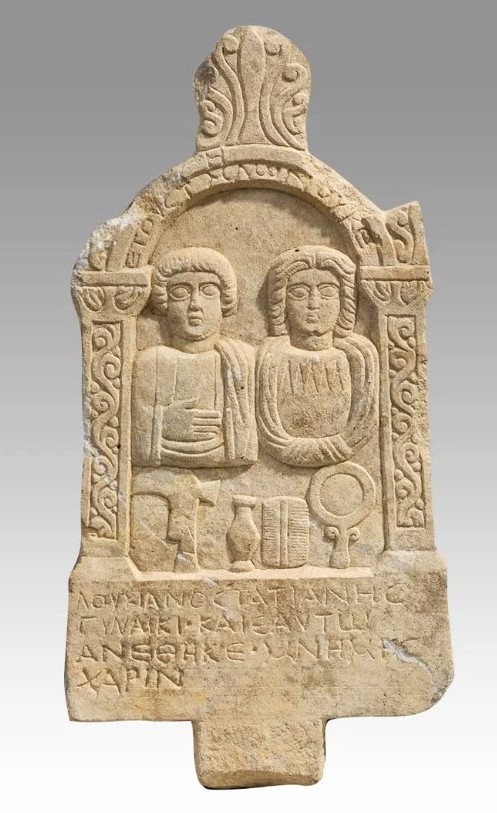 Carved for a husband and wife, the tombstone features their busts placed beneath a graceful archway, framed by two pillars adorned with scrolling motifs. The couple gazes out with almond-shaped eyes, conveying a sense of eternity. An inscription engraved on the archway notes the year of their passing — 241/4, with the text below honoring Lukianos Tatianis and his beloved wife.