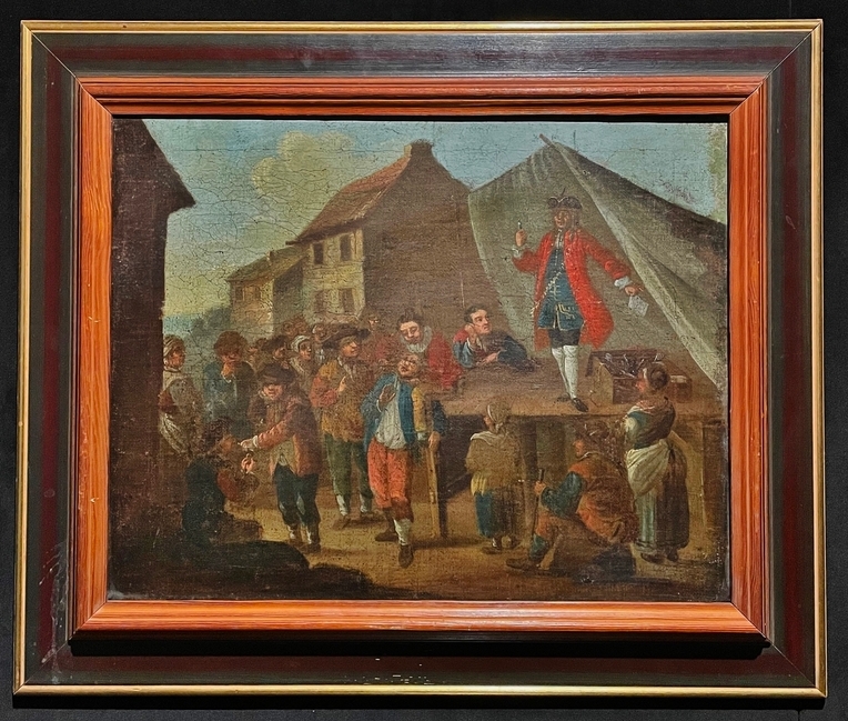 Pictured above: Wearing a red coat and black tricorn hat, this traveling salesman stands atop a podium to display his wares. He holds up a perfume bottle and extends a white handkerchief to the gathering townspeople below. This European oil on canvas dates around 1670.