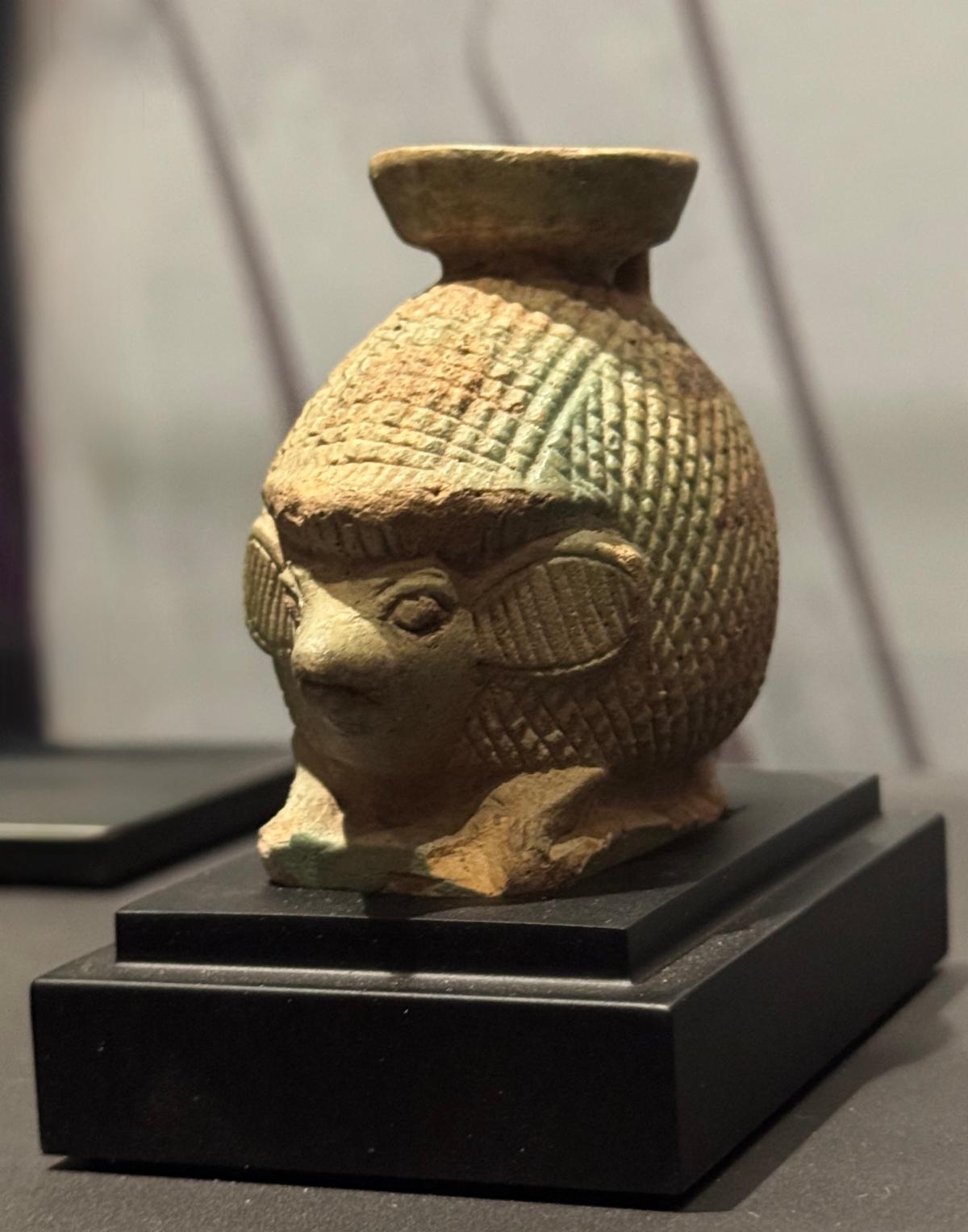 Round narrow-necked aryballos were popular means of storing perfume in ancient Greece and were often made into unique shapes such as this hedgehog. The Greeks considered hedgehogs to be an industrious creature and this vessel would have contained perfumed salve or ointments for promoting male virility and hair growth!