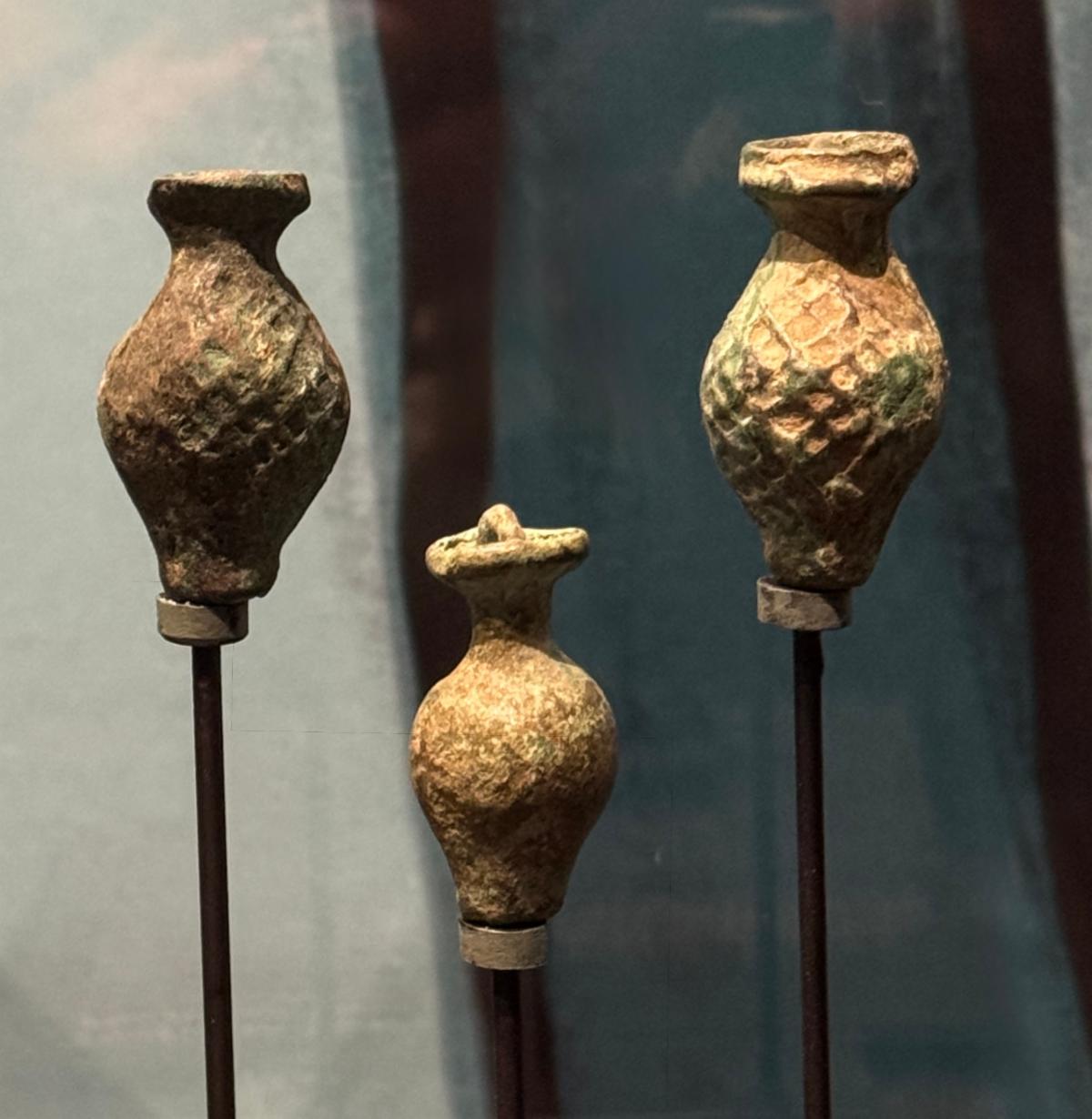 These three vases would have been worn around the neck, allowing perfume to drip from the open bottom onto the wearer's chest. They're from China's Tang Dynasty, 618-900 CE.