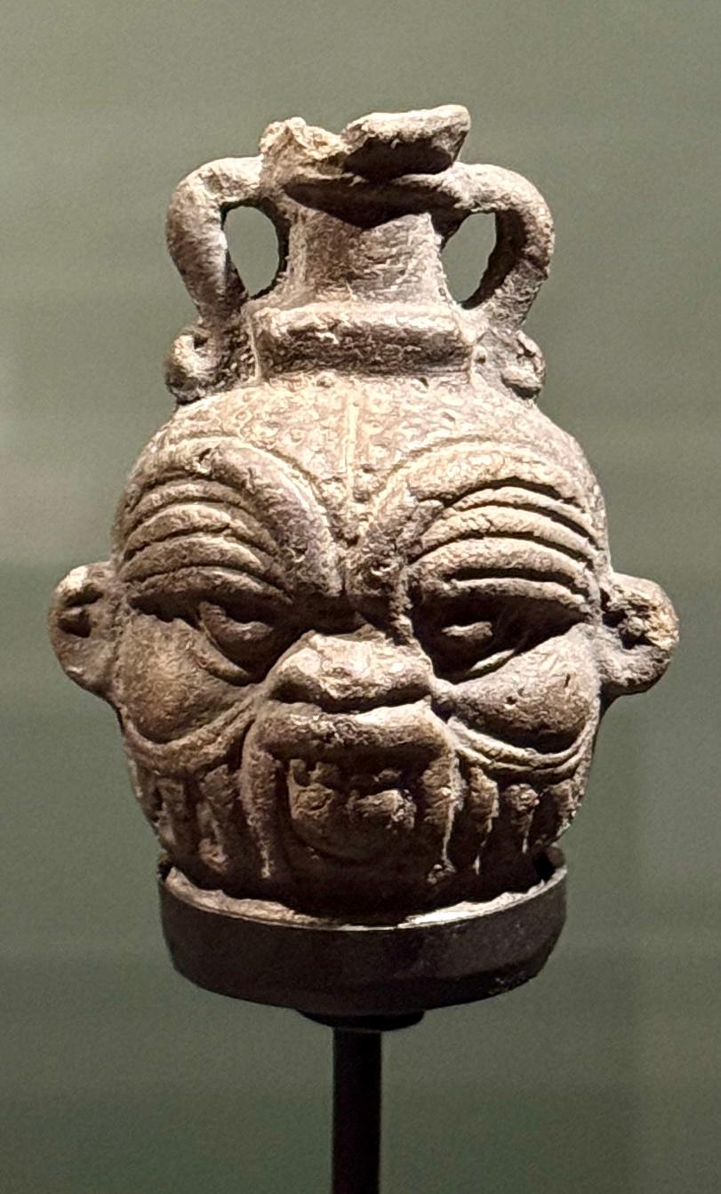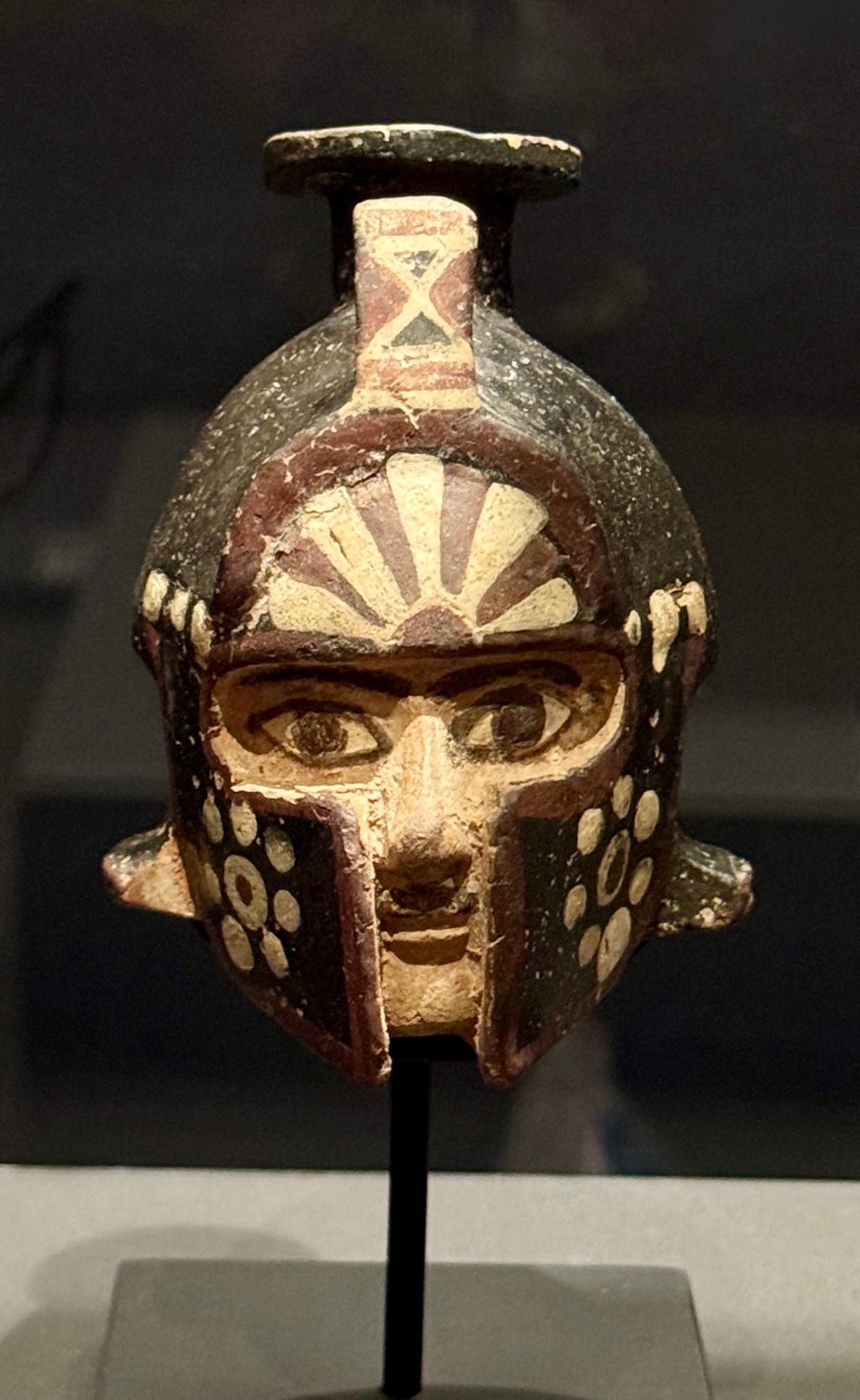 This painted terracotta aryballos (above) is in the form of a warrior's head and is wearing an Ionian helmet. It dates from around 590 BCE.