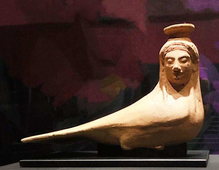 (Below) Although this woman wears a veil and a classic archaic smile, her long, dove-shaped body identifies her as a siren. These mythical part-bird, part-women creatures are known for using their beautiful singing voices to lure sailors to their deaths. Most likely Greek, probably Corinthian, from the 6th century BCE.