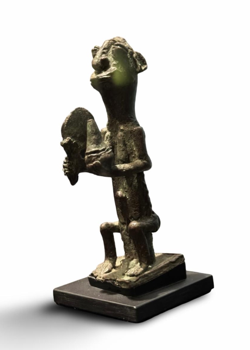 This 15th century African bronze female figure is holding a mirror and perfume vial.
