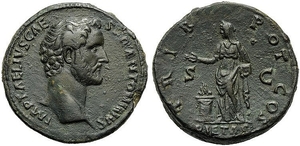 A Roman Sestertius coin from around 138 CE, made of brass. One side features emperor Antonious Pius. The other side features Pietas, the divine personification of piety depicted as a woman standing by an altar, holding a box of perfumes for sacrifice.