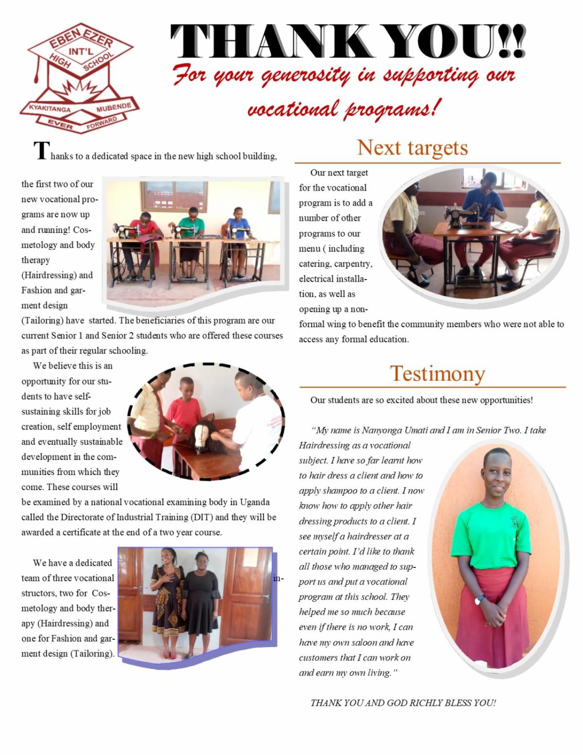 , see the enthusiastic newsletter below created by our head teacher about the vocational programs started this term at the high school. Kids are being equipped with practical skills to help them earn a living. Progress!