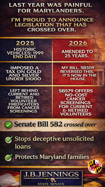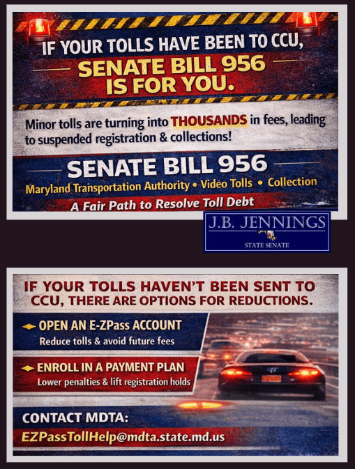 That’s why I introduced Senate Bill 956 - Maryland Transportation Authority- Video Tolls - Collection. This legislation creates a fair, commonsense path to resolve toll debt and help Marylanders get back into compliance, without being buried under excessive penalties.