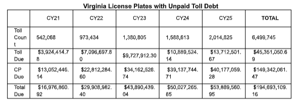 The chart above shows the volume of E-ZPass violations tied to Virginia tagholders, highlighting the need for stronger enforcement and compliance. The Maryland Vehicle Administration has sent out more than 58,000 letters to Marylanders who own Virginia tags, who statistically hold a higher percentage of accidents and unpaid parking violations.