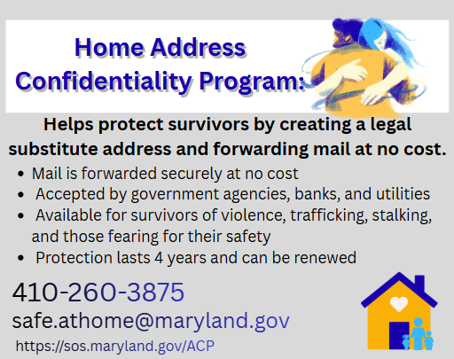 For those in difficult and dangerous situations, this program offers a practical path to greater security and peace of mind. Taking steps to protect your personal information can make all the difference. Learn more or apply: here; email: safe.athome@maryland.gov; or call: 410-260-3875.