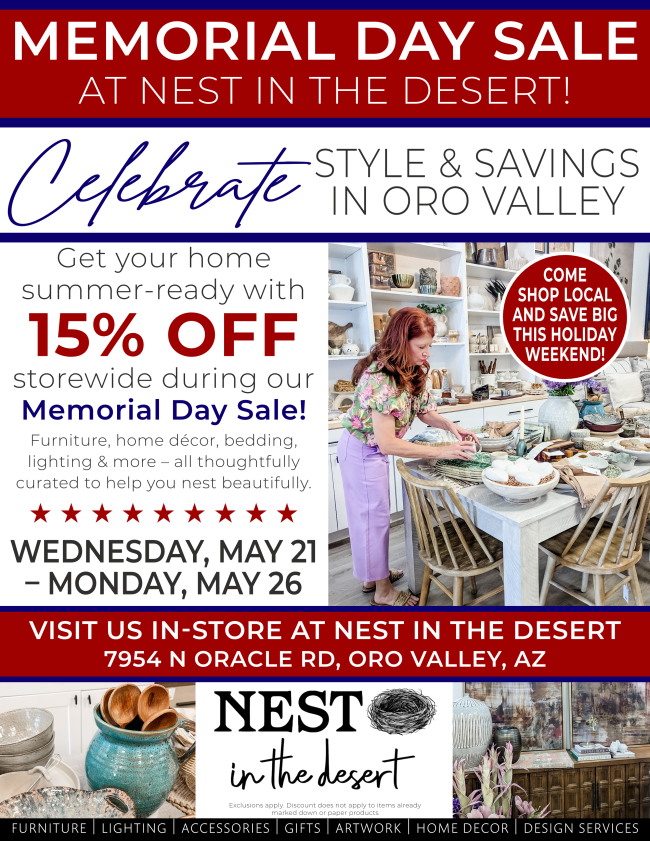 ------The Memorial Day Sale, 15% off storewide except for paper products, runs through Monday, May 26, at Chamber member Nest in the Desert.