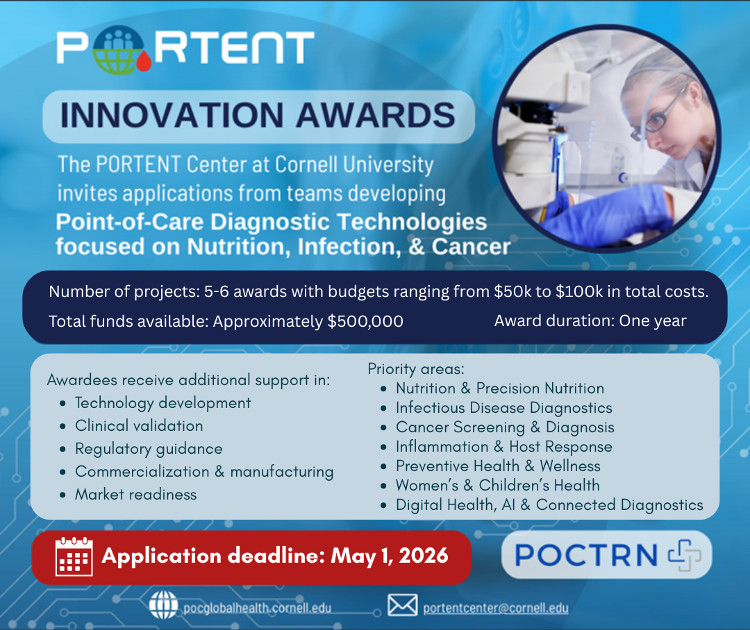 PORTENT, a Center for Point-of-Care Technologies for Nutrition, Infection, and Cancer at Cornell University is a one-of-a-kind international network of clinical, training, and device development facilities with worldwide expertise in point-of-care diagnostics, their application and commercialization. A member of the POCTRN network, the PORTENT Center is focused on supporting development, clinical validation, commercialization, and deployment of point-of-care technologies in locations where access to better diagnostics can have the largest impact.