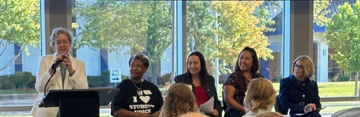 Led by Mary Ellen Daneels, Illinois Democracy Schools Director, four representatives of the DSN engaged in a conversation about "How Shall We Live Together?": Margie Smagacz, administrator from Chicago Public Schools (and former team leader at George Foreman Academy (2020), Jamie Nash Mayberry, Social Sciences teacher from Cobden High School (2023), Blanca Ruiz, Program Assistant for the Student Resource Center at West Chicago Community High School (2006), Gilda Ross, Glenbard Student and Community Projects Coordinator and the creator of the GPS Parent Series: Navigating Healthy Families, (Glenbard Schools, 2008-12). The panel discussion was followed by questions from the member audience and table discussions about how this theme plays out in our members' schools and communities.