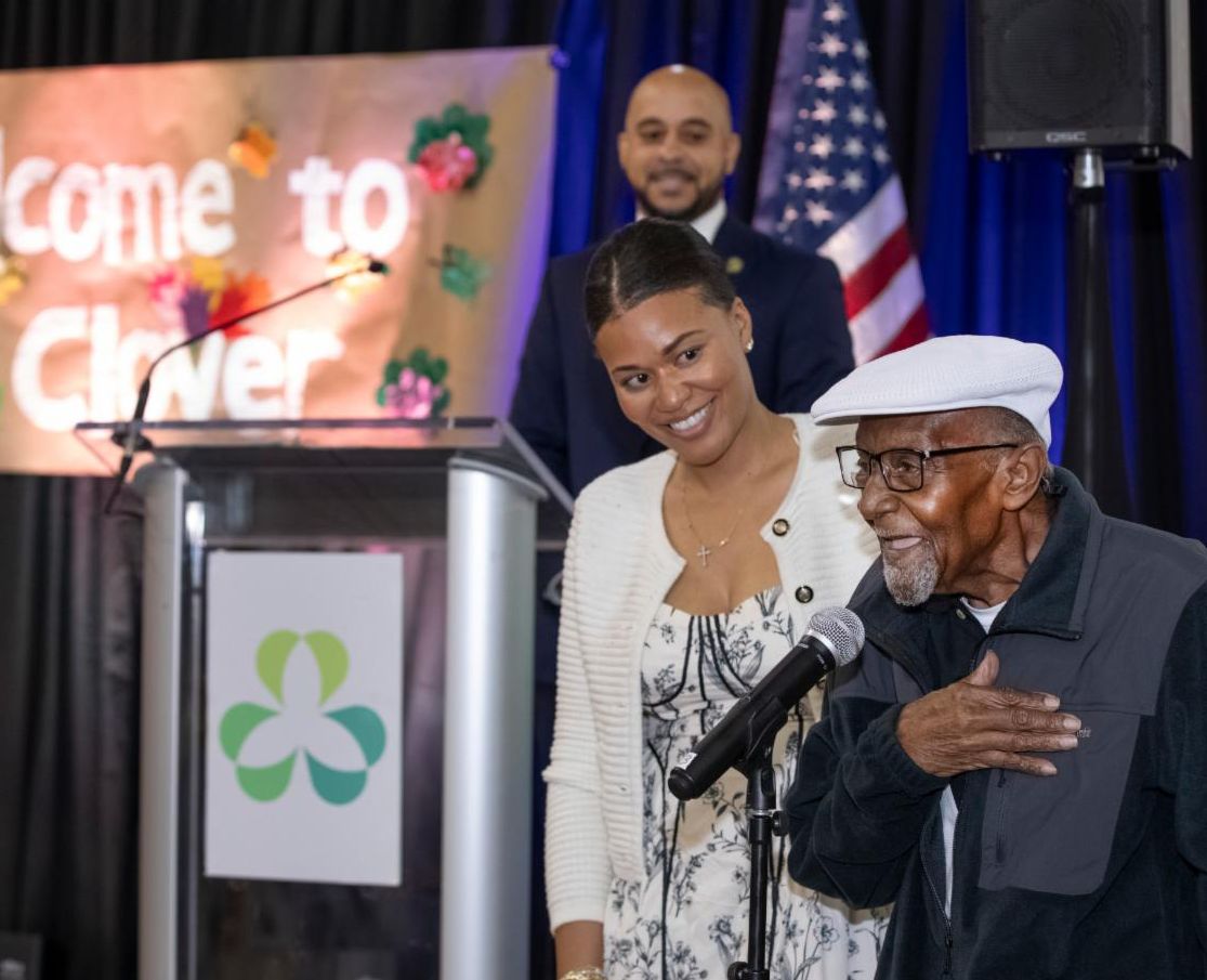 Mr. Arthur Watson — U.S. Army veteran, Clover Cares participant, and King of our 2025 Mardi Gras Court — pictured with Clover Director of Health Services Chante Lewis - led the audience in the Pledge of Allegiance.