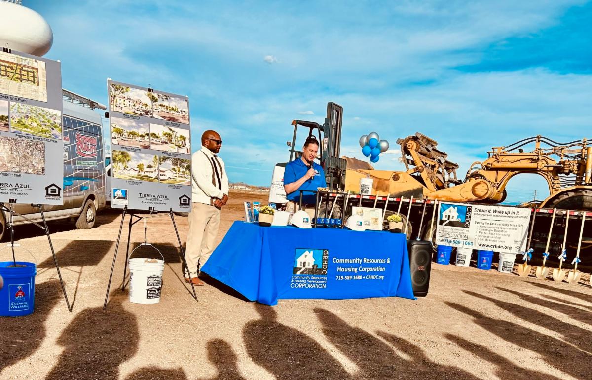 | | CRHDC Executive Director Arturo Alvarado speaks to attendees at Tierra Azul’s groundbreaking ceremony on Monday, March 24, 2025, joined by CRHDC’s Chief Operating Officer for the San Luis Valley, Ty Coleman. | | |