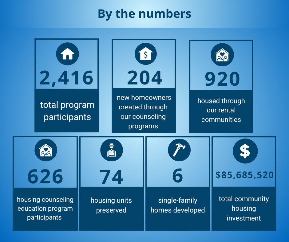 During our last fiscal year, April 1, 2024, through March 31, 2025, our programs and services continued to create meaningful changes across Colorado communities and beyond. Through our housing counseling and education programs, 626 individuals received housing counseling and/or education via our Westminster and Alamosa Homeownership Center. From those participants, we assisted 204 households achieve their dreams of homeownership. Our rental communities provided safe, stable housing for 920 people. In addition, 74 housing units were preserved, and 6 new single-family homes were developed to expand access to affordable housing.