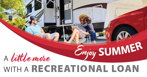 | *Annual Percentage Rate. With approved credit. Not all applicants will qualify. Some restrictions may apply. Rates subject to change without notice. Contact the credit union for full details. Offer valid for a limited time only. Max loan amount is $20,000. Federally insured by the NCUA. Equal Housing Opportunity. | | Get ready for summer with great rates on boats, campers, & RVs with terms up to 10 years! Before you start shopping, get pre-approved. | | |