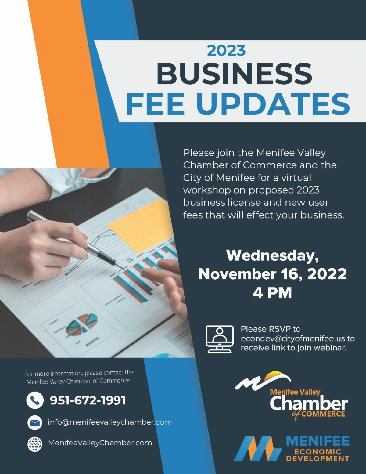 Have questions regarding your business license fee? The City of Menifee's Office of Economic Development will be holding a virtual workshop to discuss the changes on Wednesday, November 16, from 4 pm to 5 pm. Send us an email, call, or fill out the form to submit your questions or concerns.