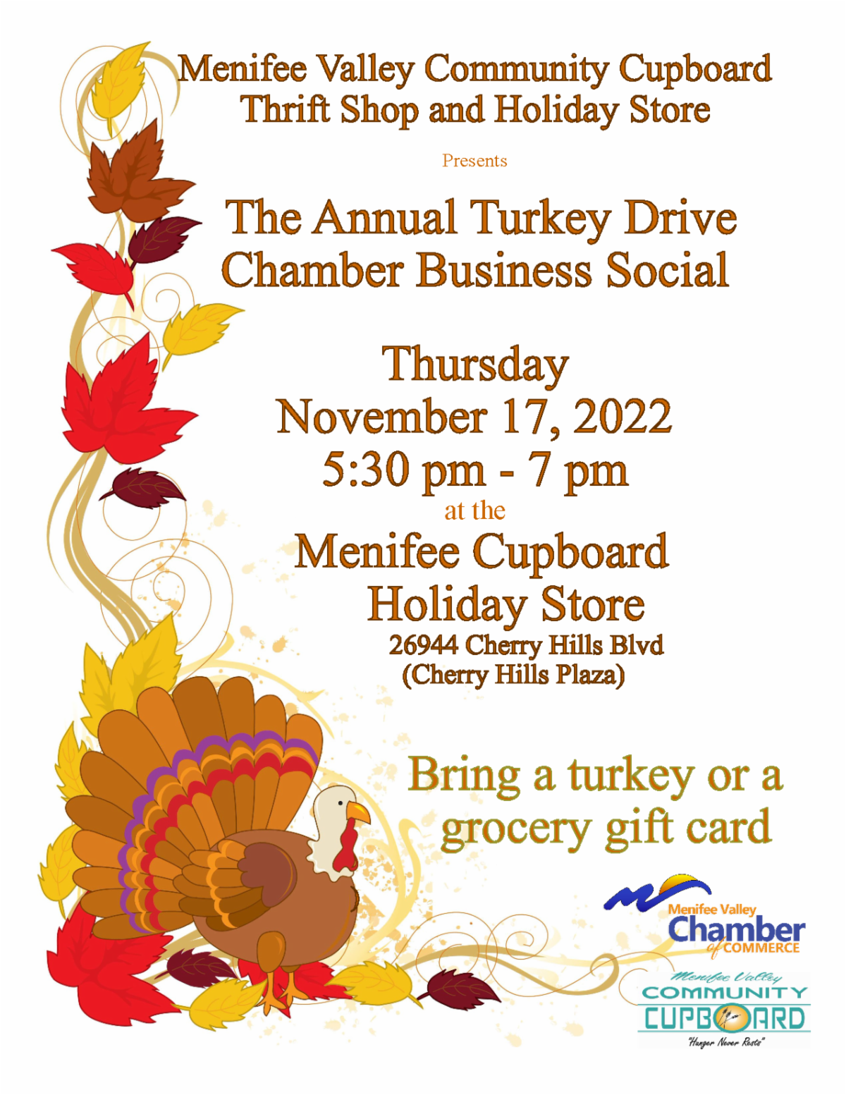We're partnering with the Menifee Valley Community Cupboard for the annual turkey drive and business social. Help us support one of Menifee's vital community organizations this holiday season.