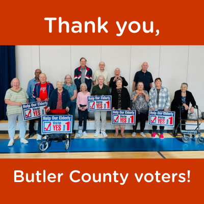 Thank you, Butler County voters, for approving Issue 1, Butler County’s senior services tax levy! The levy, a renewal of the existing 1.3.mil levy and an increase of .7 mil, was approved by 55% of voters on Nov. 4, 2025. It was the first time in 20 years Butler County voters were asked to approve an increase in the senior services levy, despite 79% growth in the county’s 60 and older population during the same time period. To learn more, click here.