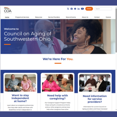 | | Council on Aging of Southwestern Ohio (COA) is a nonprofit organization dedicated to enhancing quality of life for older adults, people with disabilities, their families and caregivers. We promote choice, independence, dignity and well-being through a range of services that help people remain in their homes for as long as possible. | | | | |