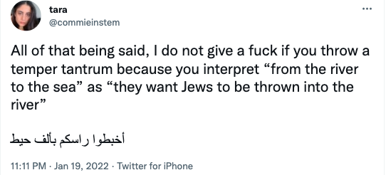 She also tweeted that she didn't care if "you throw a temper tantrum because you interpret ‘from the river to the sea’ as ‘they want Jews to be thrown into the river'".