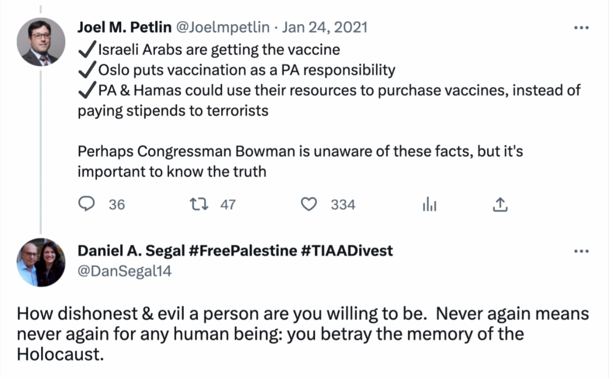 On January 25, 2021, Segal tweeted: "How dishonest & evil a person are you willing to be? Never again means never again for any human being: you betray the memory of the Holocaust." Segal was responding to a tweet defending Israel’s vaccine distribution during the coronavirus pandemic.