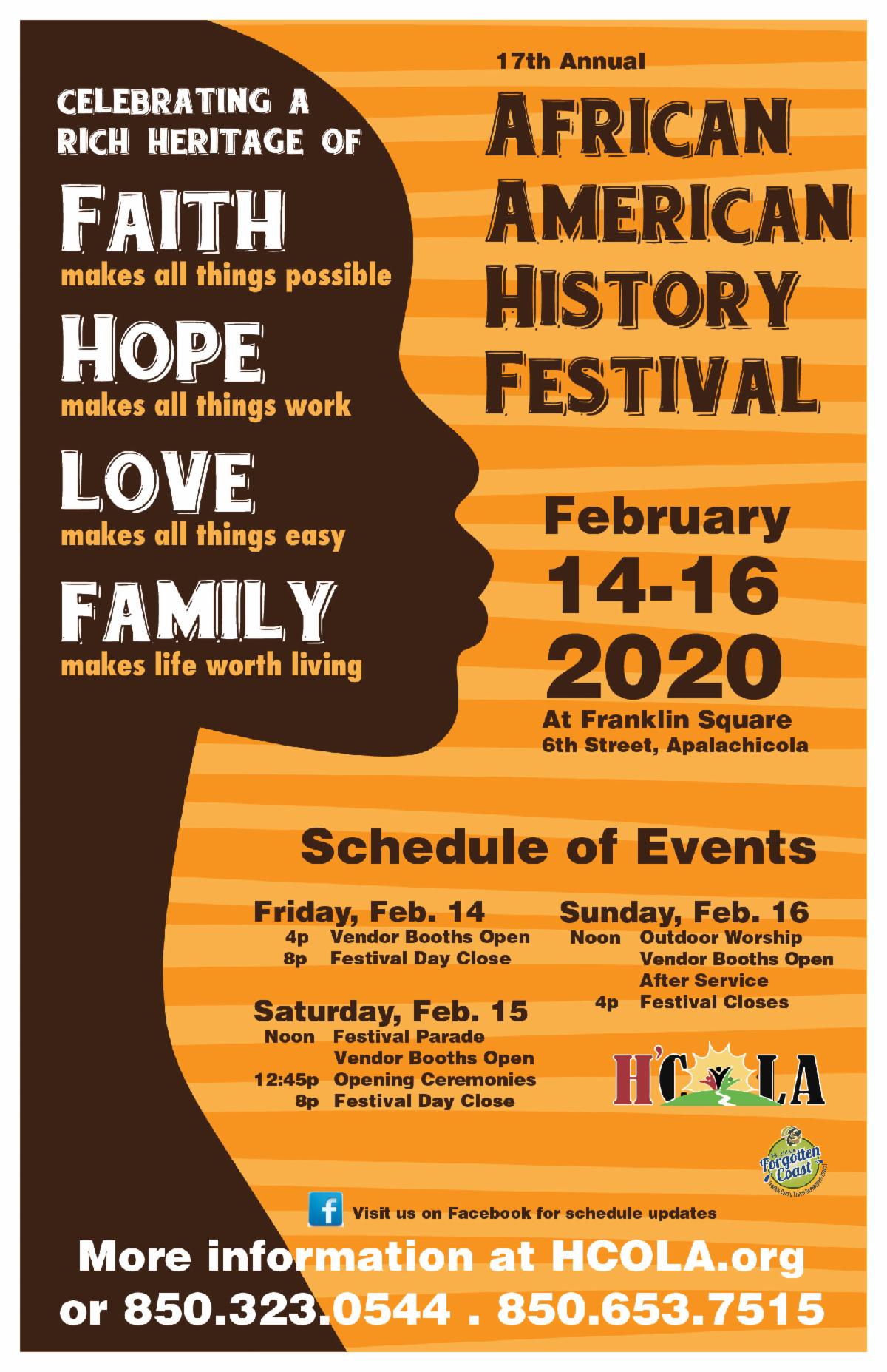 H'COLA's Annual African-American History Festival will be held Feb. 14-16, 2020. This event is a celebration of African-American history, life, music and culture. This outdoor, family-oriented event is filled with varied artists and entertainers, children's activities, arts, history, education, health & wellness and more. There will be live entertainment throughout the two day event. The event is held in Apalachicola at Franklin Square 6th Street between Avenues L&M.