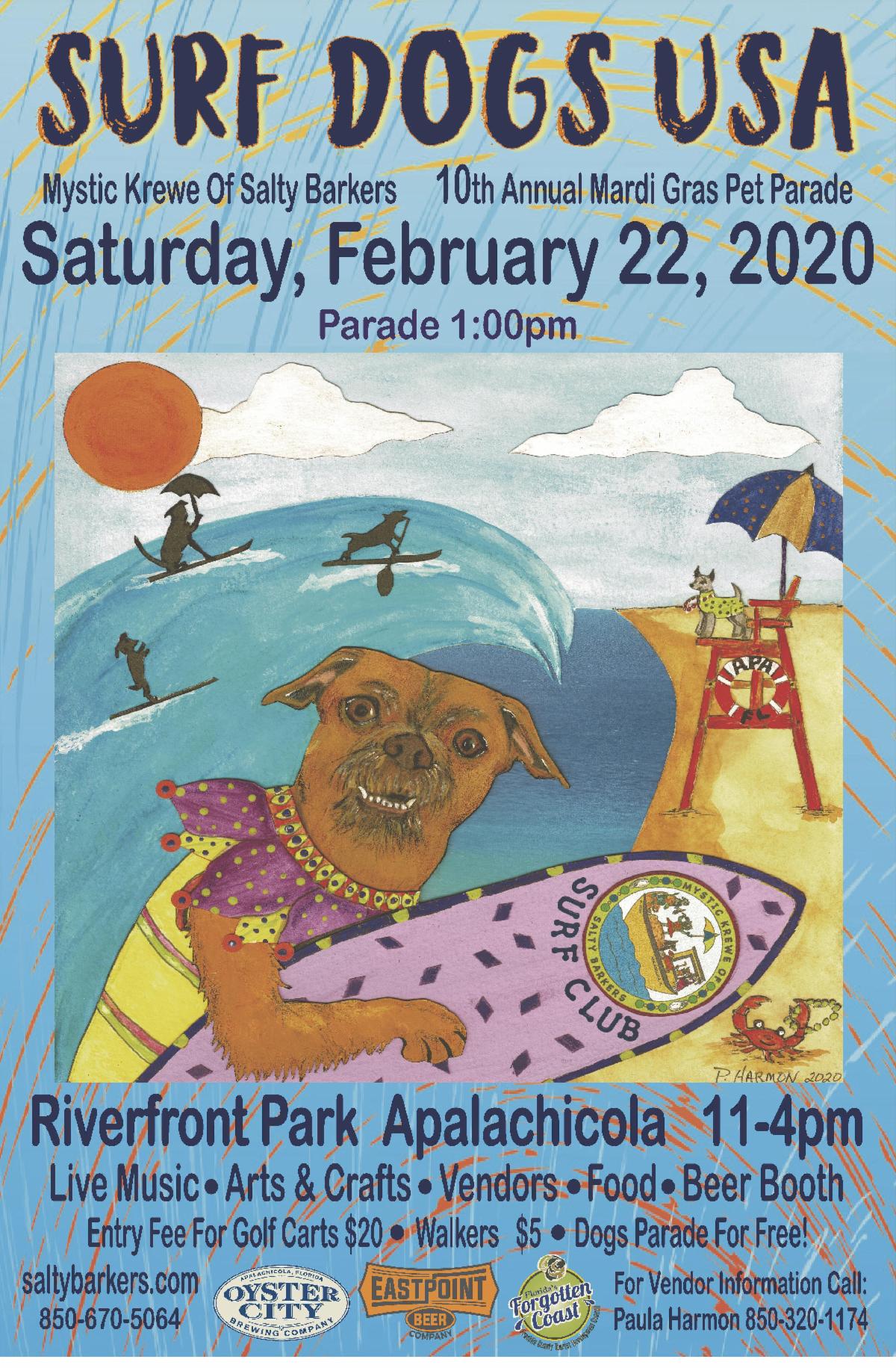 The Mystic Krewe of Salty Barkers invite you to join in the Apalachicola Mardi Gras Barkus Parade on Saturday, Feb. 22, 2020 Riverfront Park in downtown Apalachicola from 11-1 pm. Come out and enjoy the furry family-friendly street parade and festival. The band for the 2020 Apalachicola Mardi Gras Barkus Parade will be Hot Mess, a local American/Zydeco group.