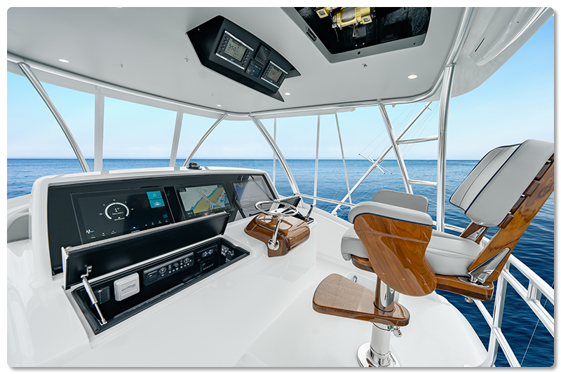 At the upper station, the Sky Bridge helm puts you on top of the world, with a clear view of the horizon and the cockpit below. Integrated displays and engine controls are laid out for quick operation. Overhead teaser reels are within reach, and the open-air design delivers the feel many captains prefer offshore.