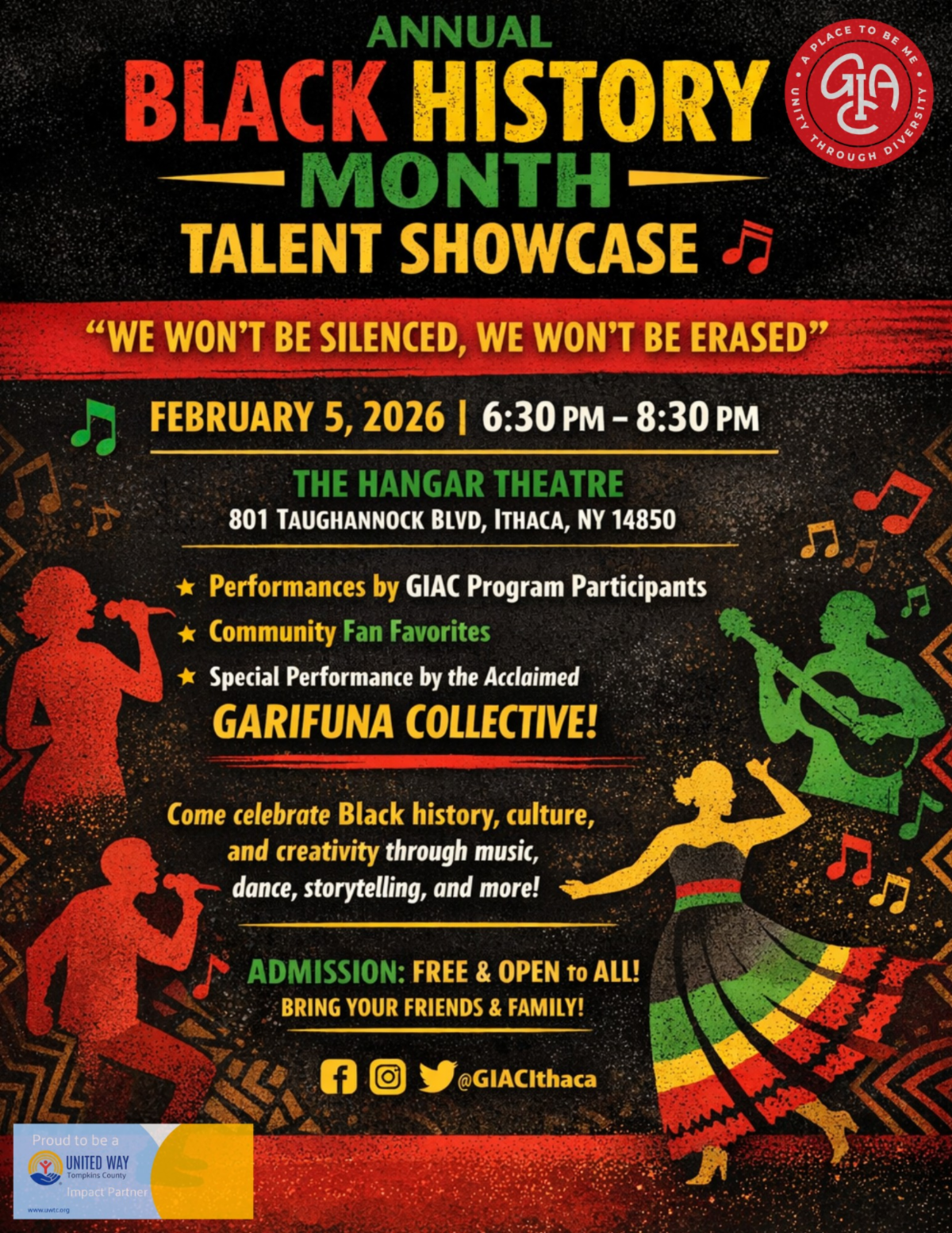 The Greater Ithaca Activities Center (GIAC) will host its 2026 Black History Month Talent Showcase at the Hangar Theatre. This year’s theme, “We Won’t Be Silenced & We Won’t Be Erased!” celebrates resilience, truth-telling, and the enduring impact of Black history and culture.