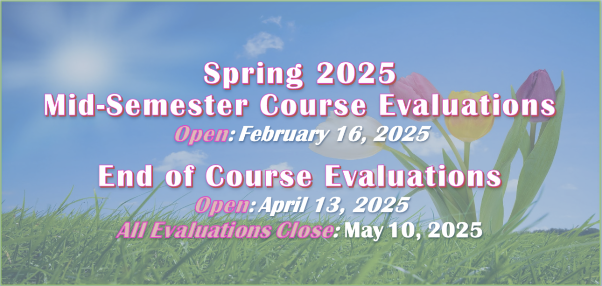 Mid-Semester Course Evaluations open February 16 while End of Course Evaluations open April 13. All evaluations close May 10.