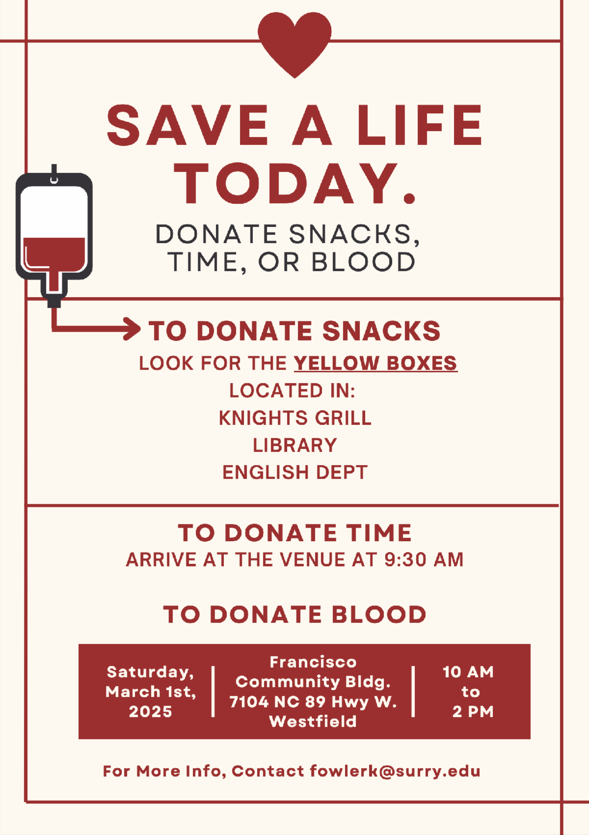 Phi Theta Kappa (PTK) will be hosting a blood drive on Saturday, March 1 from 10:00 a.m. to 2:00 p.m. located at Francisco Community Bldg. 7104 NC 89 Hwy W. Westfield.