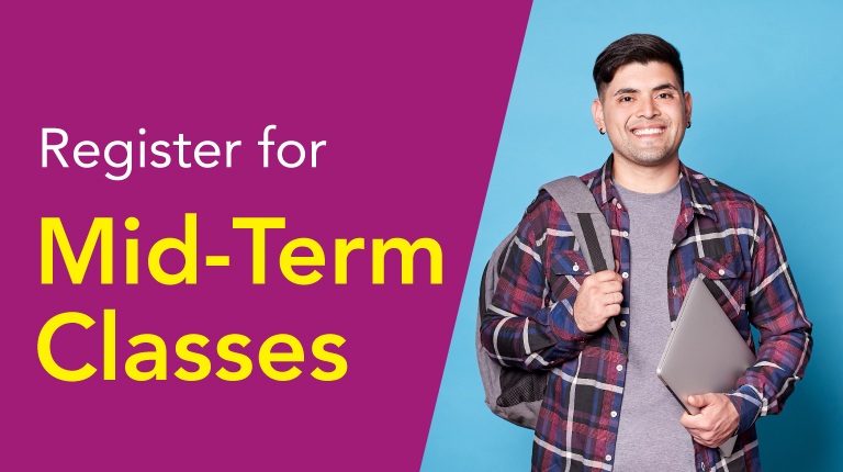 Students may now register for Spring Mid-Term classes. Classes begin March 7, 2025. Please be aware that some classes may start earlier than March 7. Check the class schedule to confirm start date.