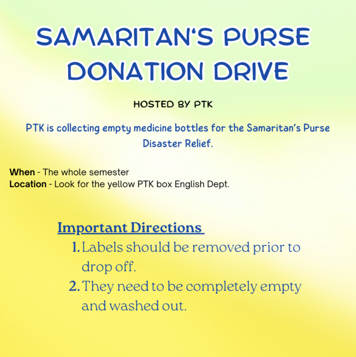 For those interested in donating, look out for the yellow PTK box located in the English Department. Donations will be accepted for the entirety of the spring semester.