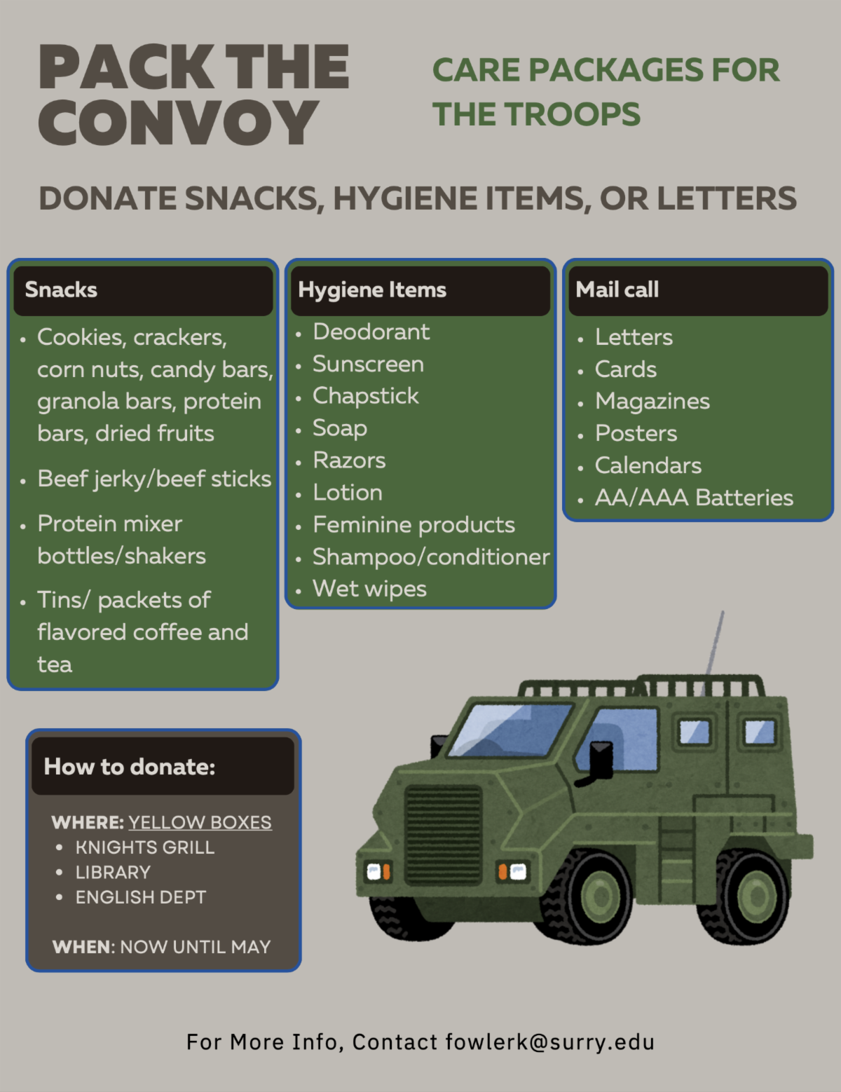 Phi Theta Kappa (PTK) is hosting a drive to donate care packages to troops. You may donate snacks, hygiene items, or letters.