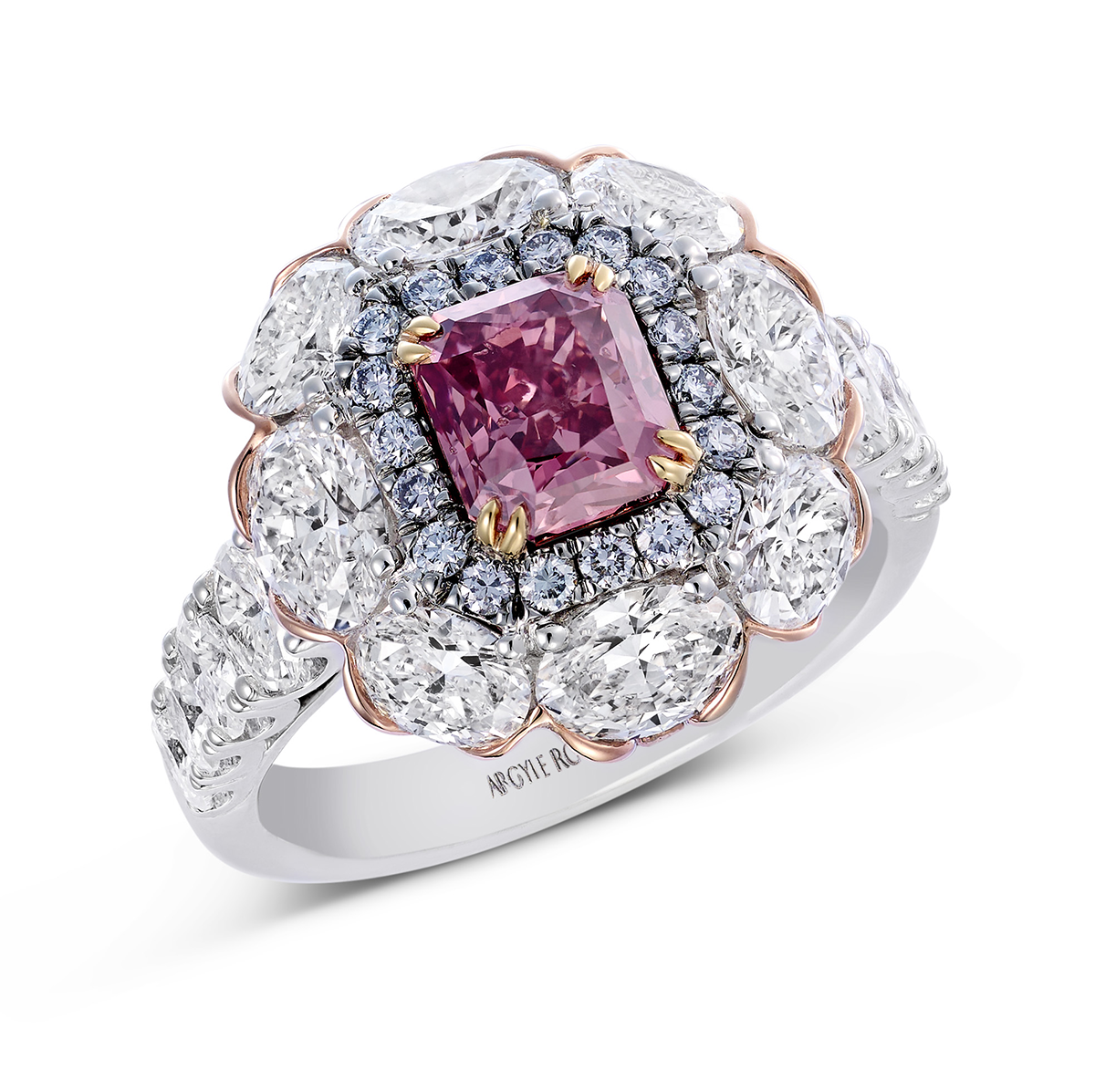 The ring is called the Argyle Rose™, highlighting 3.25 carats of Argyle pink and blue diamonds.