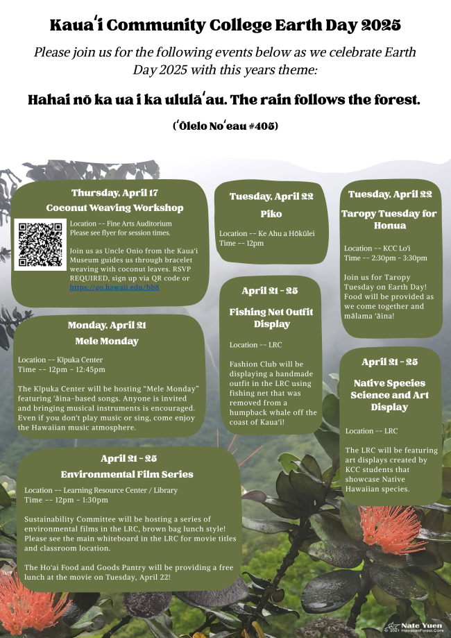 Check out the flyer to read up on all the events being offered in honor of Earth Day starting this Thursday, such as a coconut weaving workshop, Taropy Tuesday, a film series, and more! This year's theme is "Hahai nō ka ua i ka ululāʻau. The rain follows the forest." (ʻŌlelo Noʻeau #405)