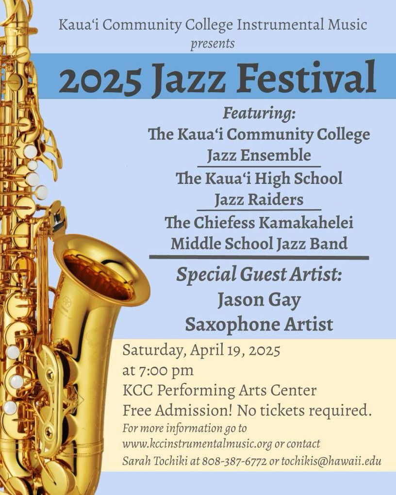 The Kaua'i Community College Jazz Ensemble, Kaua'i High Jazz Raiders, Chiefess Kamakahelei Middle School Jazz Band, and special guest artist Jason Gay on the saxophone are offering a special jazz festival performance. This event is free!