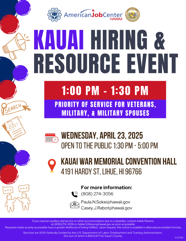 The Kauai Hiring and Resource Event is happening on April 23rd at the Kauai War Memorial Convention Hall from 1:30-5:00pm. (From 1-1:30pm there will be a priority of service for veterans, military, and military spouses). 50 businesses will be present to answer questions and for on-the-spot interviews, so bring your resume! If you need help preparing a resume or interview, contact Melissa Henry, Kauai Community College Career Counselor at mshenry@hawaii.edu.