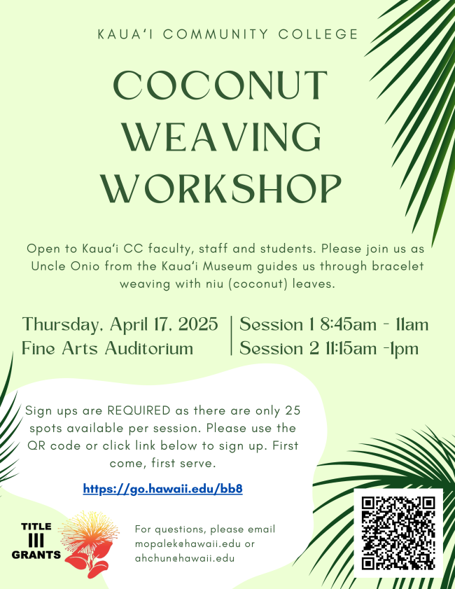 The campus is hosting two weaving workshops as part of KCC's Earth Day celebrations brought to you by Title III Grants. Please join us as Uncle Onio from the Kaua'i Museum guides us through bracelet weaving with niu (coconut) leaves on Thursday, April 17 in the Fine Arts Auditorium. This event is FREE, however sign ups are required as there are only 25 spots per session. Please use the link or QR code on the flyer to sign up.