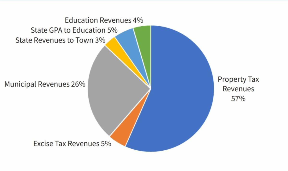 The Town's budget is funded by a combination of sources including property tax revenue (57%), Excise and Municipal revenues (31%), State-provided funds (8%), and Education revenues (4%). See pie chart