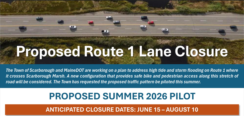 The Maine Department of Transportation (DOT) will present its plans to merge two-lane traffic to a single lane for the northbound segment of Route 1 through the marsh in a pilot this summer. This comes at the request of the Town as we study an opportunity to add bike and pedestrian facilities to a potential Route 1 climate resiliency project. See more below and on our website.