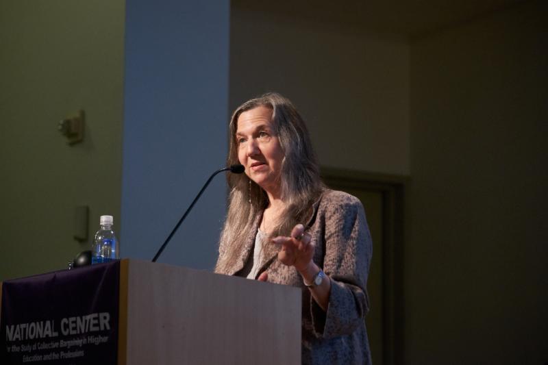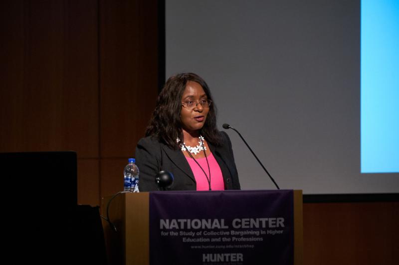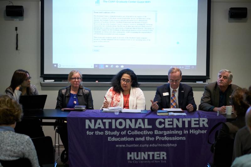 Panel on Bargaining for the Common Good with (left to right) Marilyn Sneiderman, Rutgers University School of Management and Labor Relations, Gary Rhoades, University of Arizona, Liz Perlman, AFSCME Local 3299, Barry Miller, Provost Office, York University, Malini Cadambi Daniel, SEIU, and Daniel J. Julius, Provost, New Jersey City University.