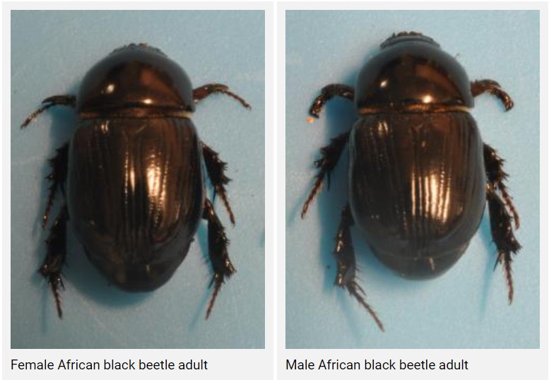 Female (left) and male (right) African Black Beetle adult | Find out more about RLEM here. | |