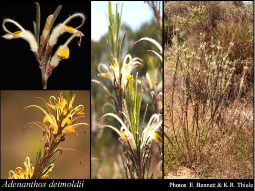 Adenanthos detmoldii (Scott River Jugflower) is native to our catchment, and is most prolific around the National Park and the Scott River Nature Reserve. It's a species of shrub in the family Proteaceae and grows to around 4m, with hairy branches and long, narrow leaves up to 80mm in length and about 5mm wide.