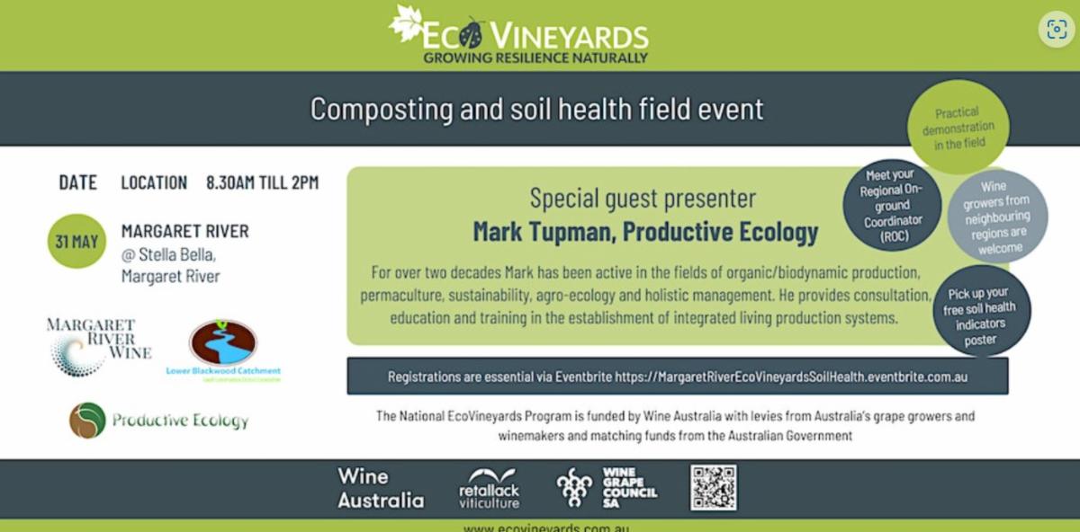 Join agroecologist/viticulturist Dr Mary Retallack, Retallack Viticulture Pty Ltd and Regional On-ground Coordinator, Kate Tarrant, Lower Blackwood LCDC, who will host a National EcoVineyards Program practical soil health field event with special guest presenter Mark Tupman, Productive Ecology, to discuss composting and soil health indicators.