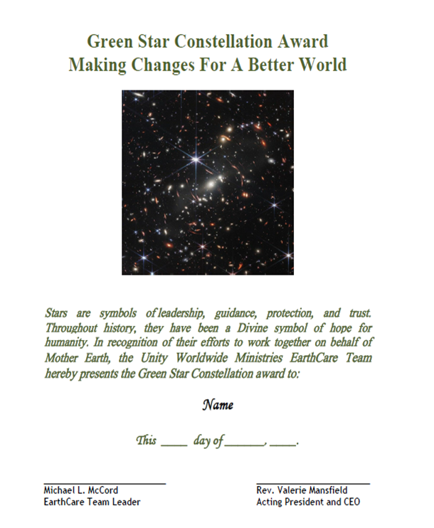 The Green Star Constellation Award recognizes the collective efforts of at least three Unity or non-Unity faith-based communities to work together to cultivate awareness, advocacy and care for all creation. The coalition must have been in existence for at least two years and completed a minimum of three significant environmental activities in the preceding calendar year.